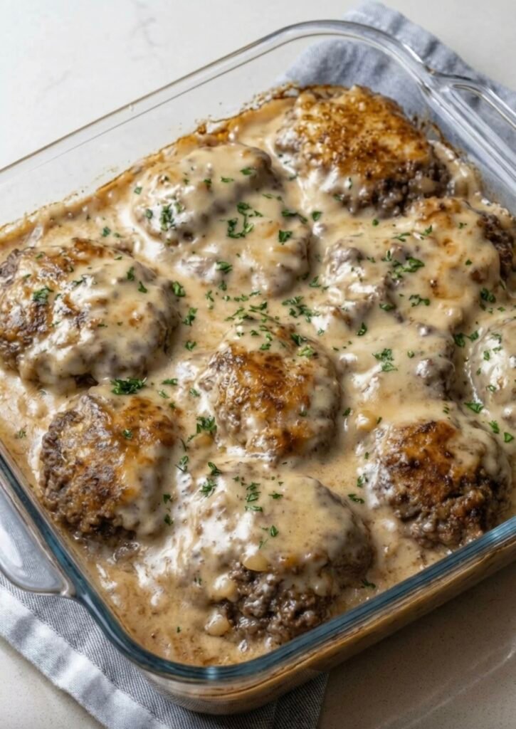 Step 8: Transfer the browned patties to the greased baking dish. Evenly pour the prepared gravy over the top, ensuring each patty is well covered.