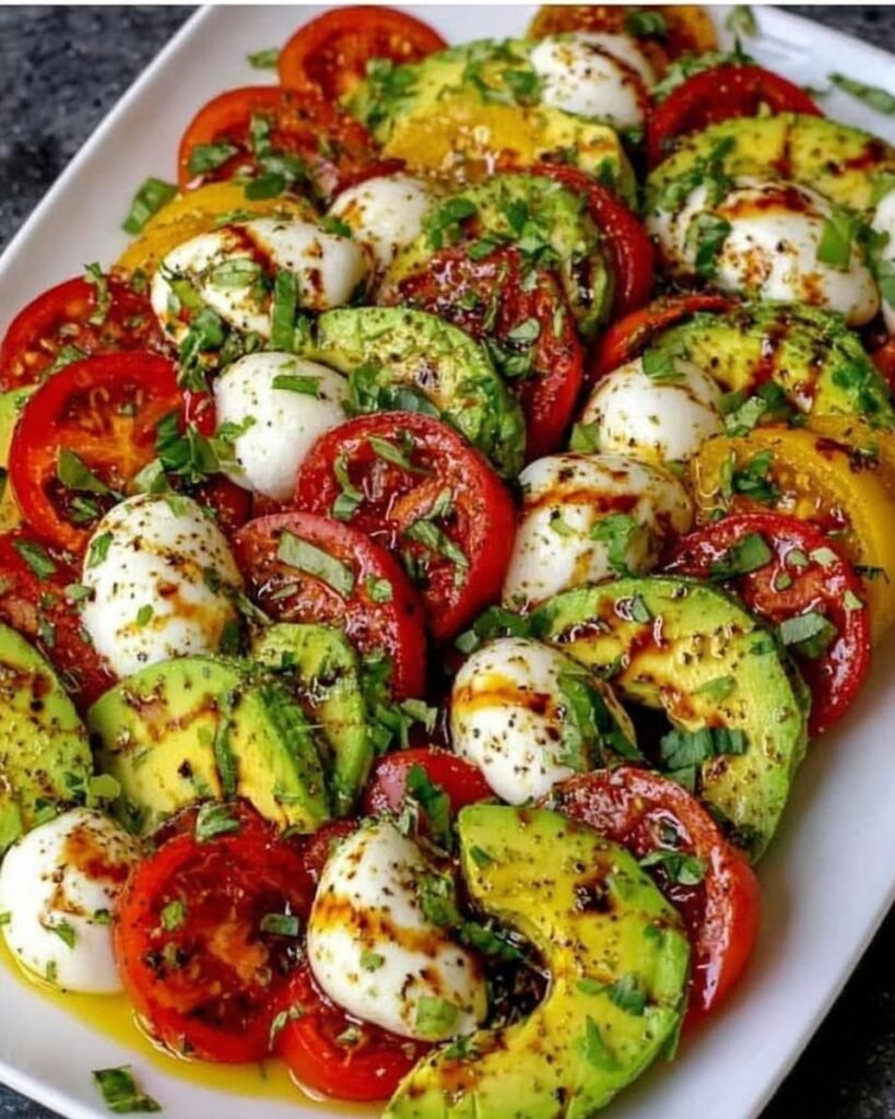 Cheesy Avocado Caprese Platter is a fresh, creamy, and colorful twist on the classic Caprese salad. Juicy cherry tomatoes, mozzarella pearls, and buttery avocado slices are drizzled with olive oil and balsamic glaze, finished with torn basil for the perfect summer bite.