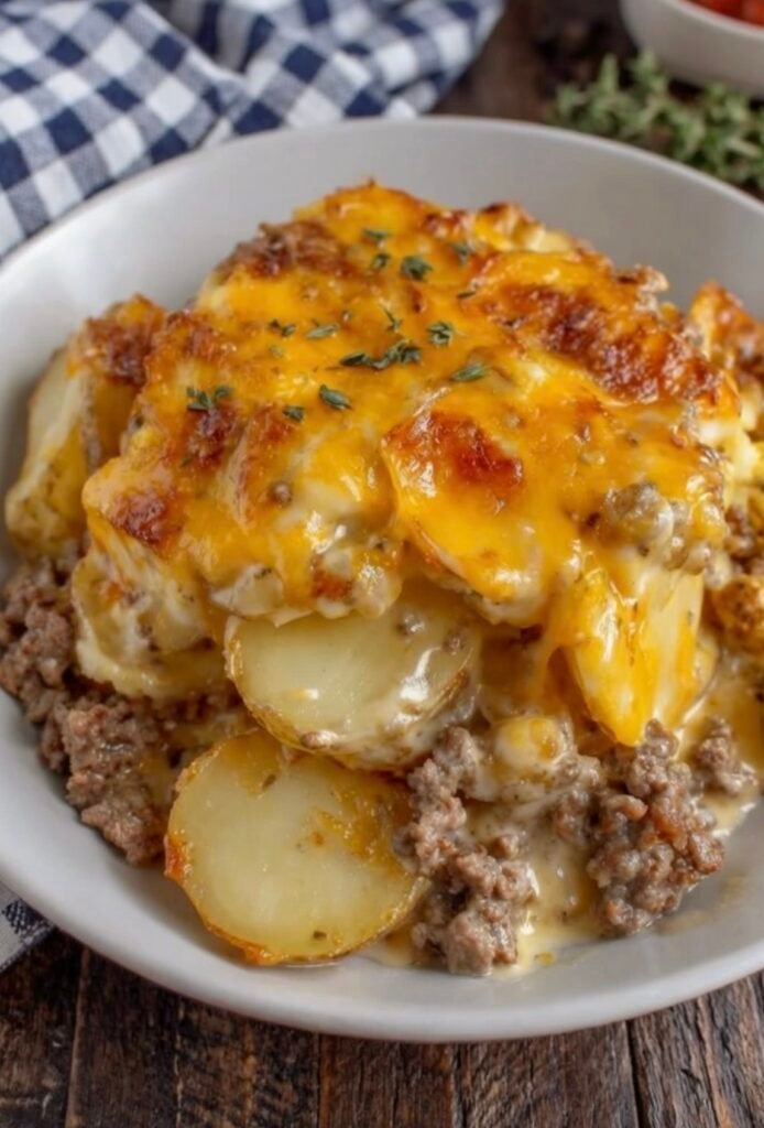 - Layer the Ingredients: In the prepared baking dish, place a layer of sliced potatoes, seasoning each layer with salt and pepper. Add 1/4 of the cooked beef and onion mixture, followed by 1/4 of the grated cheddar cheese. Repeat this layering process three more times for even distribution.