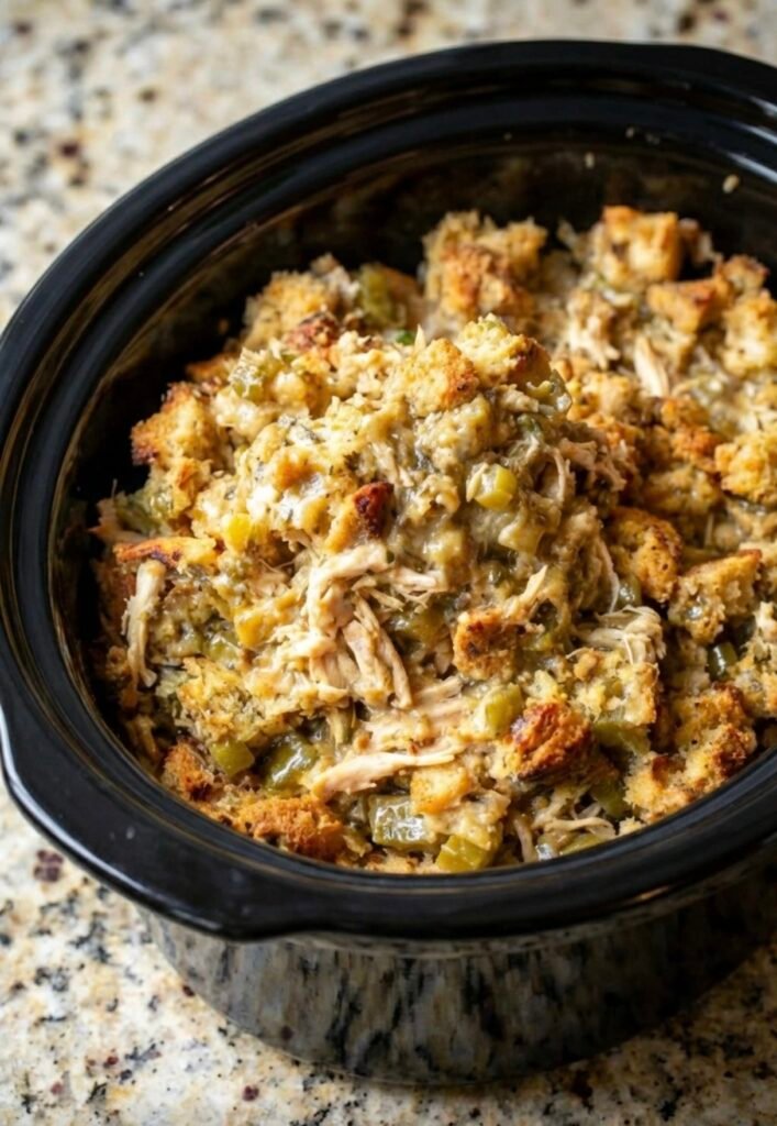 - Sprinkle the stuffing evenly over the creamy layer.