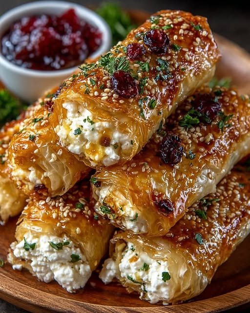 Golden Baked Feta Rolls with Sweet Cranberry Honey are a flaky, creamy, and slightly sweet appetizer made with phyllo or puff pastry, feta cheese, chopped cranberries, lemon zest, and a warm drizzle of honey.
