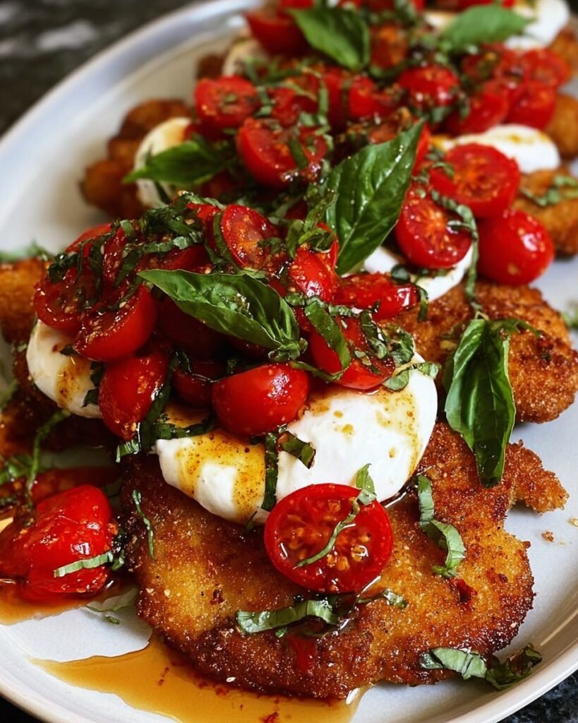 Crispy, golden chicken cutlets topped with blistered tomatoes, ribbons of basil, creamy burrata, and a sweet balsamic glaze. A simple yet elegant Italian-inspired dinner you’ll make again and again.