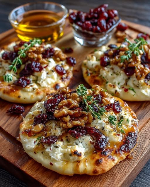 Preheat oven to 200°C (400°F). Place flatbreads on a baking tray and lightly brush with olive oil. Add slices of brie evenly, then sprinkle cranberries and toasted walnuts on top.