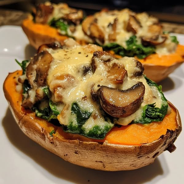 7. Spoon the creamy mushroom and spinach mixture into each sweet potato half.