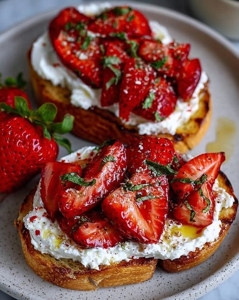 Roasted Strawberry Whipped Ricotta Toast is a quick, creamy, and elegant 30-minute recipe layered with whipped ricotta, honey-roasted strawberries, and thyme on crusty bread. Perfect for breakfast, brunch, or a light snack.