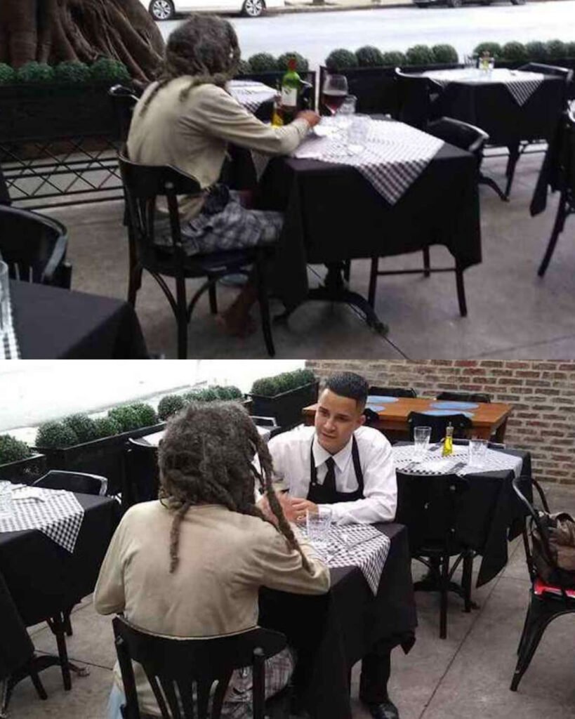 One afternoon, in a quiet corner of a fine-dining restaurant, a man with weathered hands and matted hair walked through the doors. He didn’t ask for spare change or leftover food. Instead, he looked at the waiter and said softly, “Can I have a seat? I’d like to eat here.”