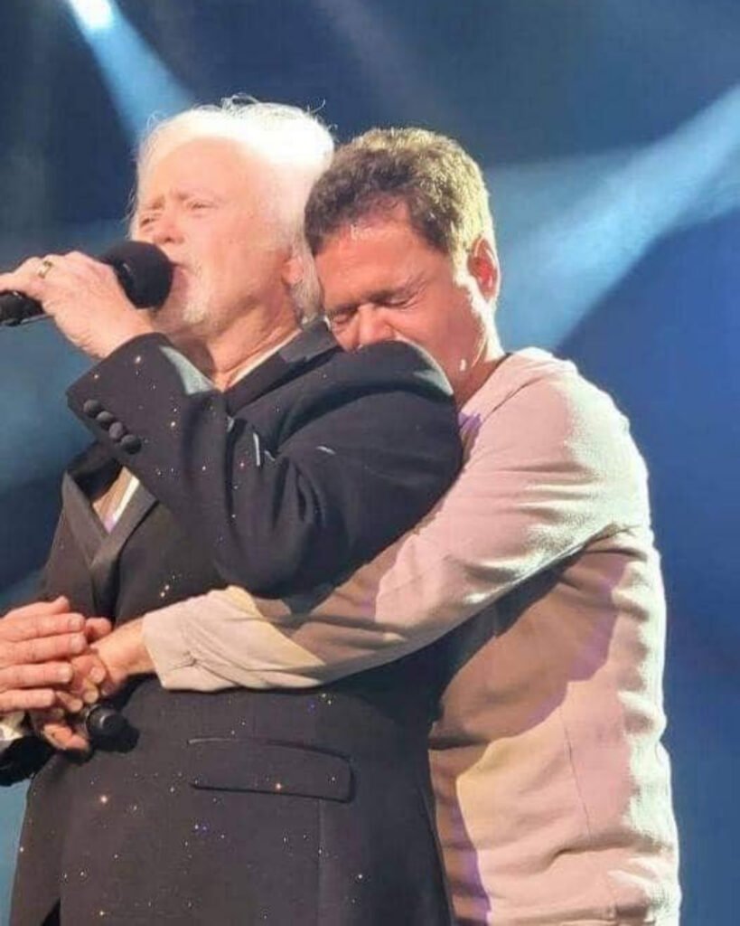 From the edge of the stage, his brother Donny appeared. No fanfare, no introduction — just a familiar presence walking toward him. The crowd gasped softly, realizing what was about to unfold.